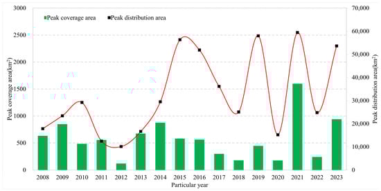 The average peak coverage area from 2008 to 2023 was 517 km2, for which the historical minimum of peak coverage area was 120 km2 in 2012, and the historical maximum of peak coverage area was 1598 km2 in 2021. Comparatively, the average peak distribution area over the years was 32,476 km2, for which the historical minimum of peak distribution area was 10,125 km2 in 2012, and the historical maximum of peak distribution area was 59,440 km2 in 2021.