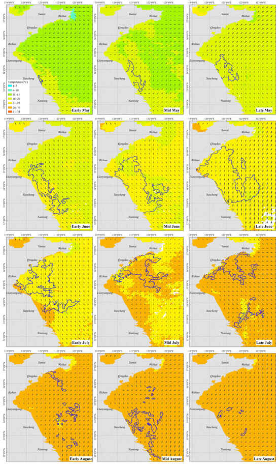 Ocean dynamic satellite data were used to invert the average sea surface temperature and sea surface wind field in each ten-day period from May to August. There are certain changes in the summer monsoon and sea surface temperature in the Yellow Sea. Taking 2023 as an example, as shown in Figure 10, the sea surface temperature began to rise slowly in early May and reached the maximum level in mid- and late August, with spatial trends decreasing from south to north. The temperature near the shore was slightly higher than that in the open sea. The sea surface wind field was mainly dominated by the northward monsoon along the coastal lines to the northwest and northeast. The spatial development direction of U. prolifera was highly consistent with the distribution and changes in the sea surface wind field. Relevant research data also confirm this view. The drift path of U. prolifera green tide has obvious interannual variation, and the change in the ocean surface flow field caused by the interannual variation in the sea surface wind field is considered to be the main reason for the variation in the U. prolifera transport path [17,39].