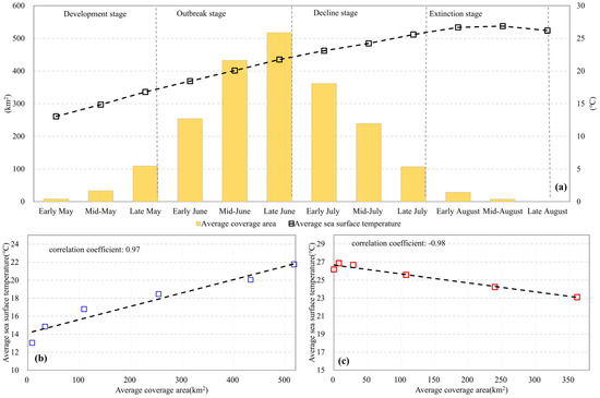 Distribution of average coverage area and average sea surface temperature: (a) average series of coverage area and sea temperature from May to August in 2008–2023; (b) correlation in the development and outbreak stage of average series in blue boxes; (c) correlation in the decline and extinction stage of average series in red boxes.