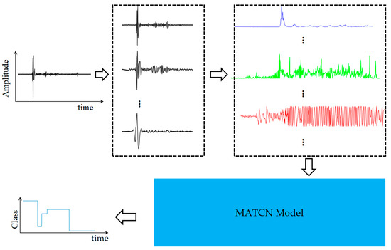 Through the learning of a time convolutional network, using instantaneous attributes as inputs, we present an MATCN model for sub-bottom sediment classification. The MATCN model simultaneously uses IA, IF, and IP data [35,36,37,38,39] as inputs and outputs the classified result. The flowchart of the classification with the MATCN model is depicted in Figure 2.
