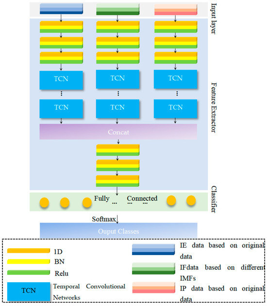 As shown in Figure 1. At first, the original received echo data is processed using EMD [40]. Then, a set of IMFs can be obtained. Based on the IMFs, the IA, IP, and IF series are generated. Concatenating IAs of different IMFs, the input IA block is built. The input IF and IP blocks can be generated in the same manner. The input blocks are subsequently fed into the feature extraction model. Convolution layers, as well as TCN blocks, constitute the feature extraction model and extract useful features under different time scales, which expand the ability to obtain different information [41,42].