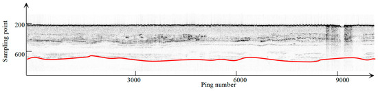 The multi-attributes can be obtained from the above. Then, post-processing is needed before putting attributes into the deep learning model. Post-processing is used to wipe out the useless information where the energy of the emitted acoustic wave is too low to convey any useful information. An SBP image is shown in Figure 3, in which, below the red line, nearly no significant reflection can be found. The acoustic wave is weak below the red line and the received signal has a low signal-to-noise ratio (SNR). Thus, the sampling points below the red line in Figure 3 should be wiped out to improve the performance of the classification method. The instantaneous attribute values of these sampling points will be set as zero.