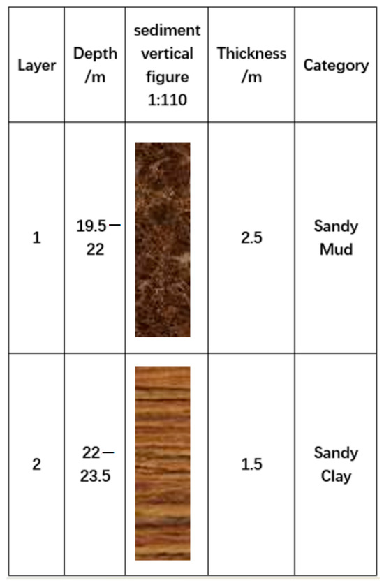 To verify the effectiveness of the proposed method, real-data experiments were performed, as described below. The study area is located in Bohai. During the SBP survey, 60 survey lines, having a total length of 240 km, were carried out using an Innomar SES 2000 Standard SBP. For this survey, a predetermined set of drill holes was planned, set to be 8 meters below the seabed’s surface. Analysis of the gathered drilling samples in the lab has led to a broad classification of the sediment in the area into two rough layers. The upper layer is primarily composed of sandy mud, while the lower is predominantly sandy clay, with minor interjections of sandy silt. Sandy mud is marked by its uneven soil quality and the abundance of coarse sand particles, along with approximately 27.3% clay content. Sandy clay consists of fine grains generally under 0.005 mm, with a few silty soil layers. The sandy silt has intermediate grain sizes, ranging from 0.005 to 0.05 mm, and the soil displays inconsistent quality, with some silt presence. Representative data from the sedimentary drilling is illustrated in Figure 5.