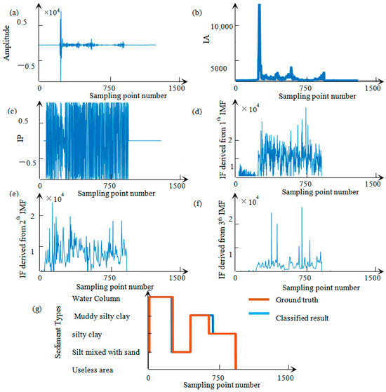 Results of the proposed method. (a) The original sub-bottom signal and (b) the IA data of (a), (c) the IP data of (a), (d) the IF data of (a), (e,f) the IMF data of (a), and (g) the classified result of (a).