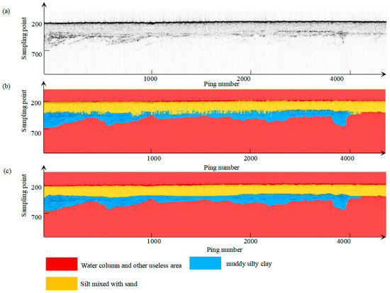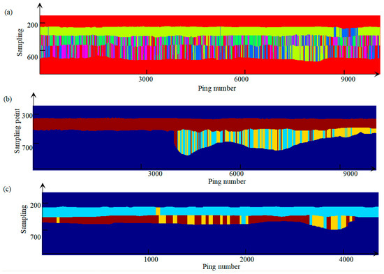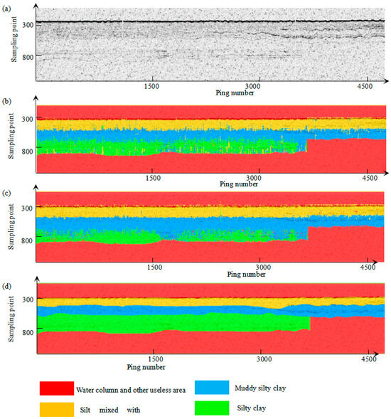 In this section, the performance of the proposed method is compared with a classification-based method [46]. This classification method chooses the horizons first. Then, based on the constraint of the horizons, various features are extracted from the layers, and the sediment types are classified based on various features. The result of the classification is shown in Figure 13, and, with the exception of the first layer, it is found that there are a large number of misclassifications. This is because deep layer echoes are weak, and it is difficult to extract effective features. Compared with the method in this paper, the effect is not good. In addition, only unsupervised classification can be achieved, and it is difficult to determine the sediment types.