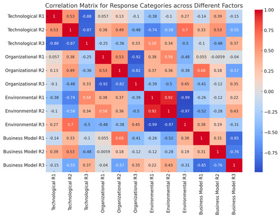 - Positive Correlations: Some response categories show positive correlations, indicating that as one increases, the other tends to increase as well. These correlations are particularly visible within the same factor category (e.g., between different response categories within the Technological factor);