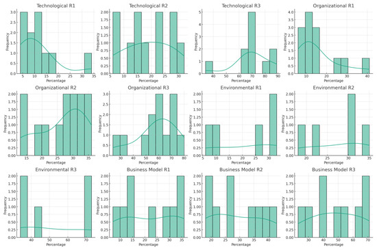 Some distributions showed a noticeable skew. For instance, several categories in the technological and organizational factors showed a left skew (more responses at the higher percentage end). Other categories, particularly in the Business Model factor, exhibited a more even or right-skewed distribution. The spread of responses varied across categories. Some categories showed a wide spread of responses (indicating diverse opinions), while others were more concentrated. Certain response categories had clear peaks (modes) where a large number of responses were concentrated. This was particularly visible in categories with a strong skew. The shapes of the distributions varied from nearly uniform to highly skewed. This variation indicates differences in how respondents perceive and respond to different factors of digital transformation.
