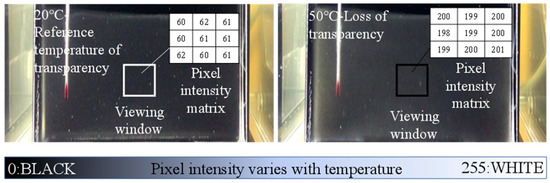 Individual pixels are the smallest unit that forms a digital image. The pixel intensity is used to describe the color and brightness of the pixels. The most commonly used pixel format is where the pixel number is stored as an 8-bit integer. The corresponding decimal values range from 0 (black) to 255 (white). When the pixel intensity is between the two extreme values, the pixel will appear gray, as shown in Figure 1. We prepared the transparent soil at the specified temperature (i.e., 20 °C) with the optimum refractive index match. We placed a black background behind the transparent soil and shot it through the soil. At this time, the black background was clearly visible as the soil was transparent. The pixel intensities of the background were sufficiently low due to the relative high transparency of the transparent soil. Conversely, when the temperature of the transparent soil increased (i.e., 50 °C), the transparency of transparent soil decreased due to the reduction in refractive index matching degree. The pixel intensity increased such that the soil appeared to be gray in color. Therefore, the visual measurement of transparent soil temperature could be achieved by establishing the relationship between pixel intensity and the temperature of transparent soil.
