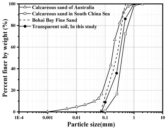 The transparent soil material used in this study was manufactured using fused quartz and mixed oil. Fused quartz is a commonly used solid particle material for transparent soil configuration due to its high purity, high transparency, high angular and similar chemical composition to natural sand [20]. The particle size distribution of the fused quartz is shown in Figure 2, which is close to that of natural marine sand [21,22,23]. The mixed oil was a blend of mineral oil (white oil) and paraffinic solvent (Norpar 12) with a mass ratio of 4:1. The refractive index of mixed oil is 1.4585 at 20 °C, which is consistent with that of fused silica. The fused quartz and mixed oil were thoroughly mixed by using a blender to form a uniform slurry. The sample was then placed in a vacuum to evacuate the air. A two-phase continuum was produced, which enabled the transparency of the transparent soil. The other specific preparation process of transparent soil is presented in the literature [24]. The physical and mechanical parameters of the transparent soil are shown in Table 1.