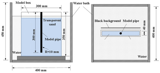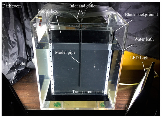 The visualization test apparatus for the submarine pipeline temperature based on transparent soil is shown in Figure 3. The test system mainly includes water bath, LED lighting device, temperature control device, model pipe, model box, image acquisition device and other parts. The water bath with dimensions of 400 mm (length) by 400 mm (width) by 450 mm (height) was mainly used to provide a constant temperature boundary for the model box filled with transparent soil. The water bath was filled with water, which was warmed by the temperature control device. The temperature control device includes a heating/cooling element and a circulating water pump to achieve a constant temperature of the water bath through the circulation of water. The model box for the transparent soil is 300 mm × 40 mm × 350 mm in size and constructed of 10 mm thick plexiglass panels. The model pipe was manufactured by using hollow copper pipe with black surface spraying. A water inlet and outlet were arranged in the inner space of the pipe. The inlet and outlet were connected with another temperature control device. The temperature of the pipe was controlled through the circulation of water inside the pipe. The specific dimensions and relative positions of the model box and model pipe are shown in Figure 4.