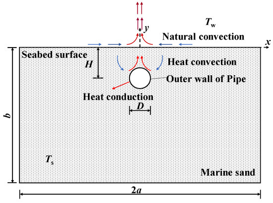As pipes are always longer than they are wide, a two-dimensional plane model of the buried submarine pipeline was used in this study, as shown in Figure 5. The length and depth of the rectangular influence range of the pipeline on the soil temperature distribution is 2a and b, respectively. The pipe section is circular with diameter of D and buried depth of H. The coordinate system is established with the corresponding center point of the pipeline on the seabed surface as the origin. The horizontal direction is the x-axis, and the vertical direction is the y-axis. The sea water temperature above the seabed surface is TW. The initial temperature of soil is Ts,ini. The thermal conductivity of soil is Ks. There is thermal convection between the seabed surface and seawater, including natural convection.