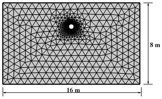 The specific mesh division used in the model is shown in Figure 6, where the mesh is finer near the pipe to ensure the convergence of numerical calculation and accuracy of the simulation. The triangular elements are used in the model, which are linear. The discretization of the domain has a total of 537 nodes and 979 elements.