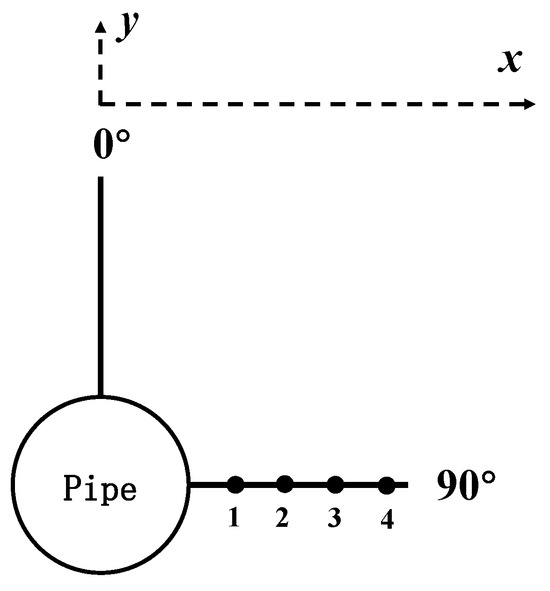 Numerical simulation was carried out to study the soil temperature distribution around the pipeline under different buried depths and pipe diameters, considering natural convection. In order to verify the validity of the model, the soil parameters and initial conditions for the transparent soil test were first used by the model, including the thermal conductivity and initial temperature of the soil (20 °C) and the temperature of the model pile (50 °C). The results of the numerical simulation were compared with those of the transparent soil test. After the verification stage, the parameters of marine sand were substituted into the model for the numerical simulation. The specific calculation conditions of numerical simulation are shown in Table 4. Combined with reference [25], the calculation time of the model was 60 days. For heat transfer analysis during start-up, 4 temperature monitoring points (named as point 1, 2, 3, 4, respectively) were set in the center of the pipeline along the horizontal direction of the model, with the distances far away from the outer wall of the pipe being 0.5, 1, 1.5, and 2 pipe diameters, respectively, as shown in Figure 7.