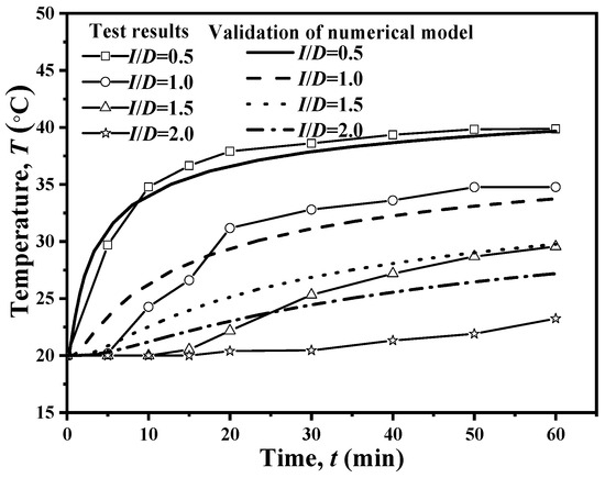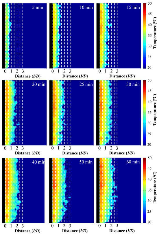 When using transparent soil to study the temperature distribution, the test results may have errors due to light conditions, impurities in the transparent soil and other reasons. In order to reduce the test error, the average value of the temperature at the same distance from the pipe wall is taken as the temperature at that distance. The relationships between the temperature and heating time at the distances of 0.5D, 1.0D, 1.5D and 2D are shown in Figure 10. It can be seen that the temperature at different locations increases with heating time, and then tends to be stable. In addition, the temperature of the soil at a distance of 0.5D increases rapidly after the start of heating, while the temperature of the soil at distances of 1.0D, 1.5D and 2D begins to increase after 5 min, 10 min and 30 min, respectively. It indicates that the influence range of temperature gradually expands with the increase in time. The soil temperatures at different locations all tend to be stable after 60 min.
