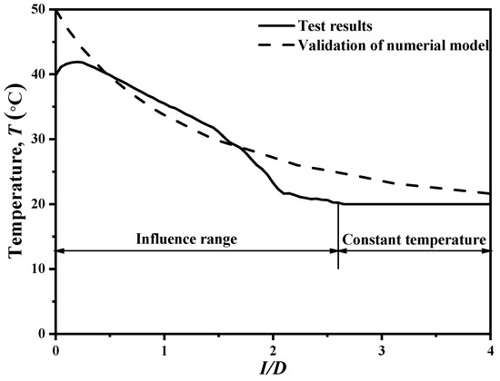 After the temperature is stable (60 min), the temperature distribution at different distances from the pipe wall is shown in Figure 11. It can be observed that the temperature gradually decreases with the increase in the distance from the pipe wall. The temperature influence range that can be observed is about 2.6D. At the distance far from 2.6D, it is difficult to use transparent soil to observe the temperature due to the small temperature change. Moreover, the test results of transparent soil at 0~0.3D decreased significantly, which may be related to the reflection of the model pipe wall. The light reflection of the pipe wall affects the test results.