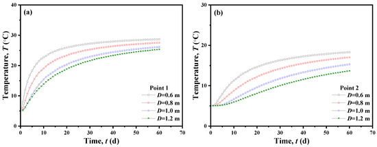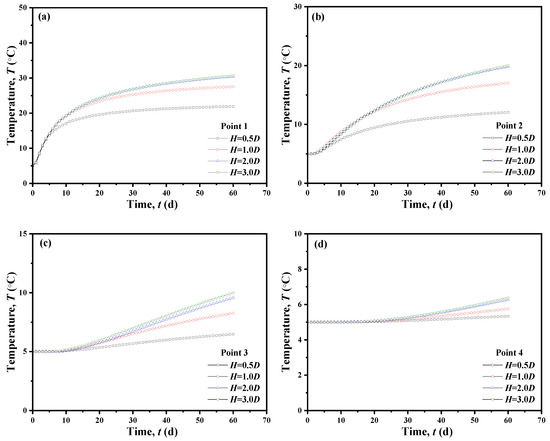 The soil temperature at different locations around the pipeline over time under different buried depths and pipeline diameters are shown in Figure 12 and Figure 13. It can be seen that in the early stage of pipeline operation, the soil temperature increases rapidly. As the soil temperature continues to rise, the heat transferred by the pipeline to the soil is gradually reduced. The rise rate of the soil temperature decreases. The rate and magnitude of temperature rise at point 4 is much lower than that at point 1, which indicates that with the increase in the distance from the pipe wall, the influence of the pipe on the surrounding soil temperature gradually decreases.