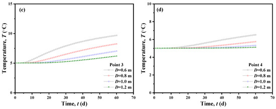 Temperature variation in soil with time at different locations with different diameters: (a) point 1; (b) point 2; (c) point 3; (d) point 4.