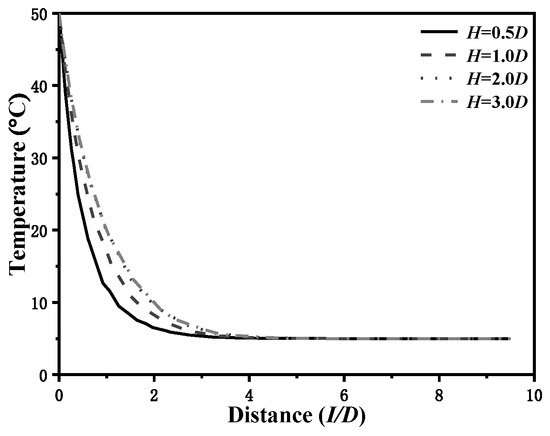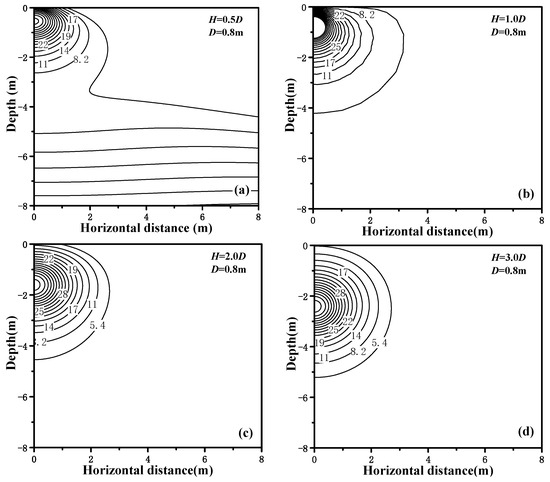 After 60 days of heating, the temperature distribution of soil around the pipeline tends to be stable. The temperature distribution around the pipeline during stable operation at different buried depths H is shown in Figure 14. It can be seen from the figure that the soil temperature gradient near the pipe wall is large, indicating that the soil is greatly affected by the pipe temperature. The soil temperature gradient far away from the pipe wall decreases, and the soil is less affected by the pipe temperature. The temperature gradient around the pipeline is relatively small at a small buried depth. With the increase in the buried depth, the temperature gradient tends to be stable, indicating that the influence of natural convection on the temperature field decreases with the increase in the buried depth.