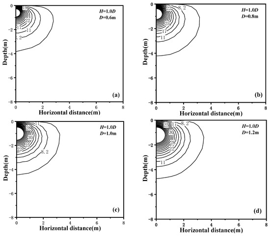 Temperature distribution of soil around pipeline at different diameters: (a) D = 0.6 m; (b) D = 0.8 m; (c) D = 1.0 m; (d) D = 1.2 m.