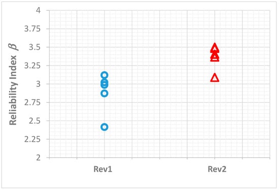 Figure 2 for Rev. 1 and Rev. 2, where the safety indices and failure probabilities are shown.