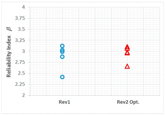 The reliability indices for Rev. 1 were uniform and close to the target reliability level of 3.09, corresponding to the target failure probability of 10