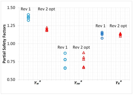 29]. This is achieved through the coordinates of the “design point”, representing the scenario most likely to occur at failure, i.e., the point on the limit–state function that has the maximum conditional probability when failure occurs. The coordinates of a “design point” are provided as the results of the SRA. By dividing these coordinates by characteristic values of pertinent variables, “rational” PSFs are calculated as: