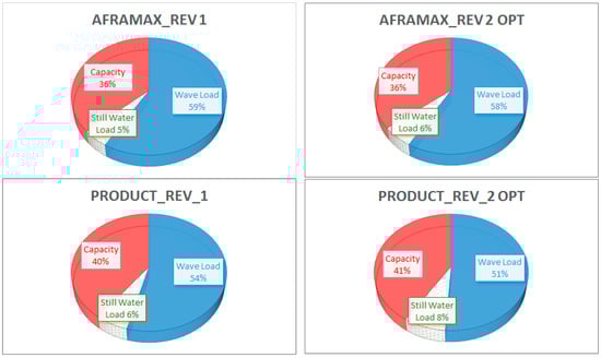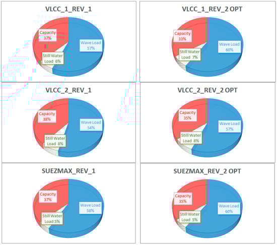 Figure 5 that the uncertainty in VWBM had the largest influence on the safety index in both absolute and relative terms. Namely, in all cases, the “share” of the sensitivity in VWBM was larger than 50%. More precisely, for Aframax, Suezmax, and both VLCCs, the importance of wave loads was 60%, while for the Product tanker it was slightly more than 50%. The importance of the uncertainty in the UBC was second most influential, representing about 40% of the total importance for the Product tanker and 30% for the remaining ships. The uncertainty in SWBM was the least important, with a “share” of about 10% for all ships. It follows from