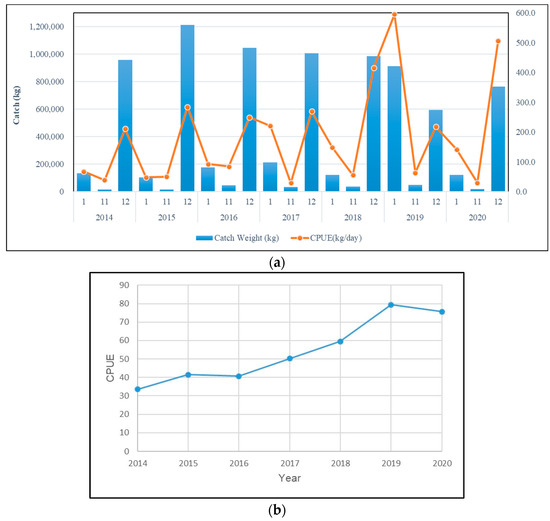 (a) Monthly catch and CPUE changes in mullet in western Taiwan waters from 2014 to 2020 and (b) yearly catch and CPUE changes in mullet in western Taiwan waters from 2014 to 2020.