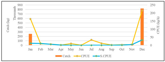 From the annual change chart (Figure 1), it can be seen that the catch of mullet is mainly concentrated around December, and from the passage of months in each year, the monthly catch and the CPUE of this species change significantly. The monthly catch of mullet ranges from approximately 1.21 million kilograms (December 2015) to approximately 760,000 kg (December 2020), and the highest and lowest CPUE values of this species from November to January are, respectively, approximately 595.6 kg/day (January 2019) and 29.3 kg/day (November 2017) (Figure 1a). Only the standardized CPUE of grey mullet was used for the analysis (Figure 2). Since the mullet fishing season in western Taiwan waters is around the winter solstice, we can see the average monthly catch and CPUE changes in mullet (Figure 2). The analysis results show that the catch of this species starts at the beginning of the fishing season (November) approximately 30.119 kg, and reached the highest production in December (approximately 822.788 kg), and then gradually drop to approximately 254.455 kg at the end of the fishing season in January; the mullet catch fall between approximately 807 and 1586 kg during the non-fishing season. At the same time, the CPUE of this species falls between 0.6 kg/h and 7.4 kg/h during the non-fishing season. But when entering the fishing season (December), approximately 216 kg can be caught per hour, and then drop to approximately 164 kg/h in January. Yearly, the highest and lowest grey mullet CPUE were observed in 2019 and 2014, respectively (Figure 1b).