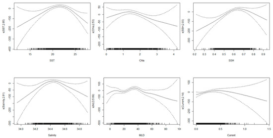 The significance of oceanographic parameters for the grey mullet S.CPUE based on AIC, GCV, and deviance explained values is showed in Table 2. Based on these values, SSH (AIC = 27,821, GCV = 1.221, and deviance explained = 21.8%) was the most significant predictor of the grey mullet S.CPUE. Furthermore, SST (AIC = 27,829, GCV = 1.278, and deviance explained = 19.4%) was the second most important oceanographic parameter, followed by MLD (AIC = 27,842, GCV = 1.297, and deviance explained = 17.3%). Current, salinity, and Chla showed deviance explained less than 10%, thus, omitted from the models construction. Impact of various oceanographic condition on the grey mullet fishery is showed in Figure 3.
