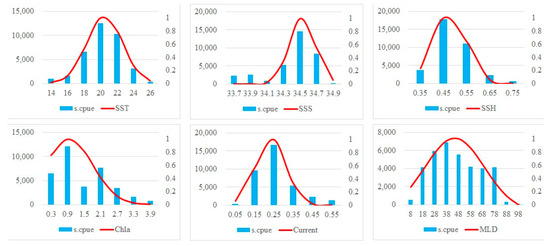 Present oceanographic suitability for grey mullet during the study period. The blue solid bars and red solid line indicates the S.CPUE and SI, respectively. Left and right y axes indicate the summed S.CPUE and SI, respectively. X-axis indicated environmental values.