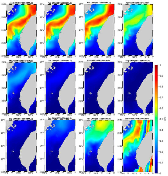 From the monthly HSI distribution results, it can be seen that the winter period is suitable for grey mullet to reproduce and grow. Starting from late October, HSI increased in the northern Taiwan ocean. HSI distribution continued to increase and spread throughout November and December, concentrating north and mid-ocean west of Taiwan (Figure 5). In January and February, HSI peaks and is closest to coastal Taiwan. Starting from March, the high HSI distribution area moves away from the coast and gradually decreases in April. During the summer (from May), the HSI index becomes very small because the high temperature is not suitable for growth of mullet.