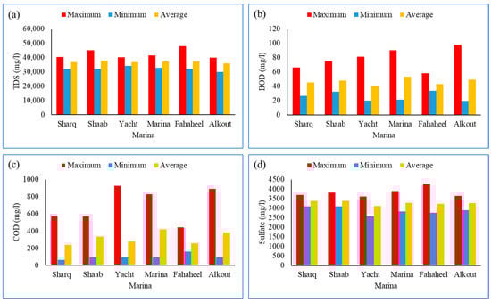 Monthly maximum, minimum, and average: (a) TDS, (b) BOD, (c) COD, and (d) SO42− in all marinas.