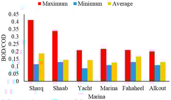 One hundred fifty-six samples were collected from various marinas, with each marina visited 3 to 4 times to ensure comprehensive spatial coverage. Within each marina basin, 6 to 8 sampling locations were chosen (detailed data are provided in Appendix A). The samples were analyzed at Kuwait University’s Department of Civil Engineering Environmental Laboratory and the National Unit of Environmental Research and Services (NURES). Figure 2 presents the maximum, minimum, and average values of TDS, BOD, COD, and SO42− for all marinas, while Figure 3 illustrates the calculated maximum, minimum, and average BOD/COD ratios.