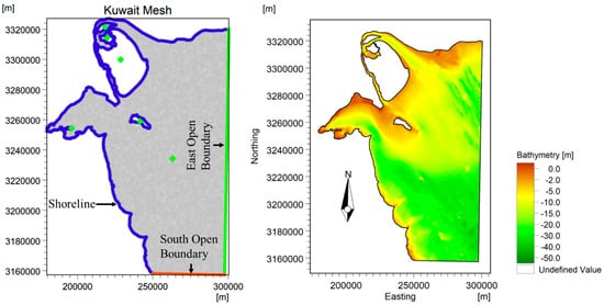 The KHDM features a flexible mesh that accurately depicts coastal regions with horizontal, unstructured, and vertically structured elements. This configuration facilitates refined meshing near complex land boundaries, enables precise resolution, and increases accuracy []. The model’s reliability depends on the mesh quality and boundary conditions, as coarse meshes and inaccurate boundary conditions can increase numerical errors [].