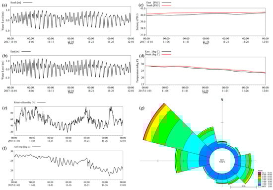 The KHDM model’s basic input parameters from the previous study [] and calibration processes are listed in Table 3. The model also incorporates heat exchange parameters for meteorological conditions. For the latent heat, the default values of constant in Dalton’s law, wind coefficient in Dalton’s law, and critical wind speed of 0.5, 0.9, and 2 m/s, respectively, were used. The default values of heating and cooling transfer coefficients of 0.0011 were used for sensible heat. The light extinction parameter was set to 1.4 for the short-wave radiation, and the Beta in Beer’s Law was kept at the default value of 0.3. For long-wave radiation, the calculations of the long-wave radiation were set as “empirical” in the model. The air temperature, relative humidity, and the 10 m u- v-components wind data were obtained from the European Centre for Medium-Range Weather Forecasts (ECMWF)—ERA5 hourly data on single levels []. Figure 5 shows samples of the relative humidity (e) and air temperature (f) at the center of the Kuwait Bay entrance during November 2017. The wind’s direction is mainly from the northwest, north, and northeast directions (Shamal wind), as indicated in the wind rose plot shown in Figure 5g. The model’s wind friction was set to vary linearly with the wind speed, and the friction was set to be 0.0006 at a wind speed of 0 and 0.0027 at 25 m/s [].