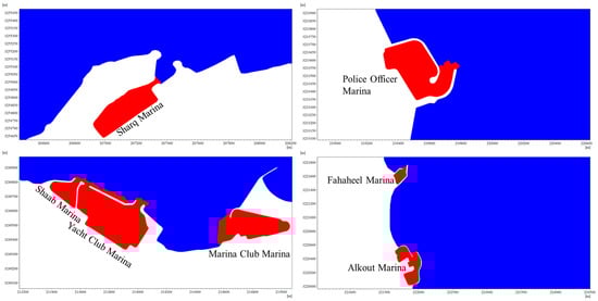 Marinas were modeled using fine meshes, where element sizes were explicitly tailored, ranging from 5 m within to 300 m outside the marinas. The boundary conditions for these meshes were derived from the validated KHDM model. The interior of the marina basins features a maximum element area of 10 m2, while the area outside the marinas is set at a maximum of 4800 m2. A single refined flexible mesh was created for the closely situated Shaab, Yacht, and Marina Club Marinas. Similarly, a fine mesh was developed for the adjacent Police Officer, Fahaheel Club, and Alkout Marinas. All meshes include three open boundaries. Unique to Sharq Marina, there is a navigation channel that is 3 m deep and extends 1600 m northwest from its entrance. The specific characteristics of each marina are detailed in Table 6.