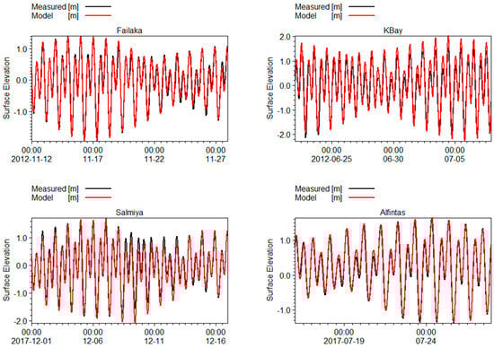 Measured versus model water levels at Failaka, KBay, Salmiya, and Alfintas stations.