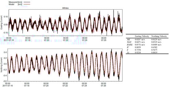 For tidal currents, the KHDM accurately predicted conditions at the Alfintas station (Figure 8). The lower coefficients of determination (0.6382) and coefficient of efficiency (0.5675) are attributed to irregularities and sudden peaks in the data, which align with observations from previous studies in Kuwait and other locations [,,]. Despite these variations, the KHDM effectively predicts water levels and tidal currents.