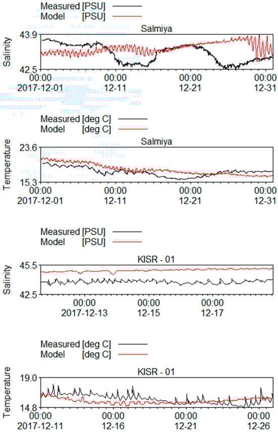 Challenges were encountered when aligning model outcomes with measured data from the Salmiya and KISR-01 stations (Figure 9). Discrepancies primarily resulted from the absence of proximal salinity and temperature measurements during the simulation. Dependence on secondary data sources such as ERA5 and the Boundary Conditions Generator for MIKE 3 led to observable variations: salinity was overpredicted by an average of 1.23 PSU, while temperature was underpredicted by 2 °C. Despite these minor deviations, the model accurately captures the general patterns and trends of measured values consistent with known levels in the area [,].