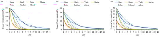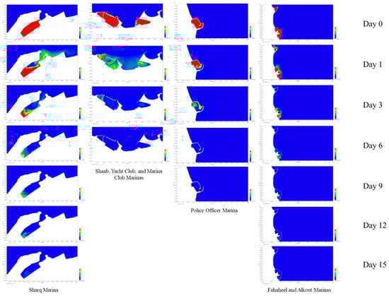 The transport module simulated the concentration of a tracer within the marinas, assuming an initial concentration of 100% inside the marinas and 0% outside (Figure 6). The model ran for 16 days to encompass complete tidal cycles, focusing on outputs like surface elevations, tidal currents, and tracer concentration.