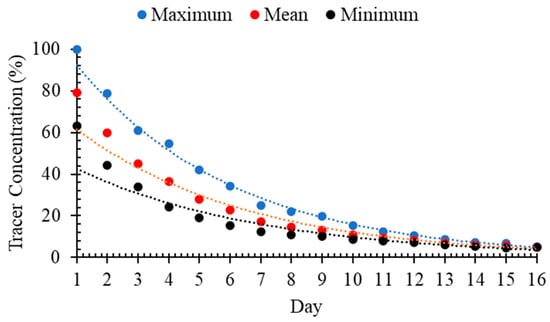 Equations (4)–(11) assume a well-mixed basin with no return of pollutants during flood tide. Equations (7)–(11) are exponential, indicating that any initiated pollution will never completely leave the basin. Researchers propose other empirical equations based on the specific conditions and assumptions listed in [].