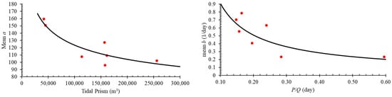 where M is the mass of a scalar object and is the mass flux of a pollutant inside the basin. Refs. [,] recommend an alternative approach, especially when only the tidal prism and range are available. This approach involves the tidal prism P, mean basin volume ∀, a modification factor k, and the tidal period T, as follows: