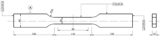 The standard tensile test employed rectangular cross-sectional ratio specimens with a proportionality factor of 5.65. The thickness was 12 mm, and the width of the parallel section was 20 mm. The theoretical original gauge length was 87.53 mm, while the actual gauge length was 90 mm. The length of the parallel section was 110 mm, and the total length of the specimen was 350 mm. The specific geometric dimensions are illustrated in Figure 1. The markings in Figure 1 follow the specified guidelines set forth by the Chinese national standard.