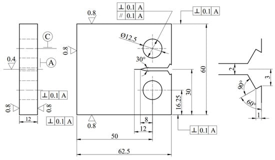 The specimen dimensions are designed according to GB/T 21143-2014 “Unified Test Method for Quasi-static Fracture Toughness of Metallic Materials” [34], with width 50 mm, thickness 12 mm, and pre-crack length of 4 mm. A pre-existing crack is machined at the front end of the specimen opening. The specific geometric dimensions of the specimen are illustrated in Figure 3, and the physical appearance of the CT specimen during the experiment is depicted in Figure 4. To ensure the similarity of material properties among all specimens, they are sourced from the same steel plate, with sampling performed in the L-T direction, i.e., the direction of steel plate rolling. In accordance with GB/T 6398-2017 “Test Method for Fatigue Crack Growth Rates of Metallic Materials” [35], all specimens undergo cutting, grinding, polishing, and other processes to meet roughness and surface tolerance requirements, facilitating experimental pre-processing and observation.