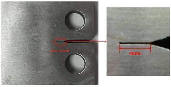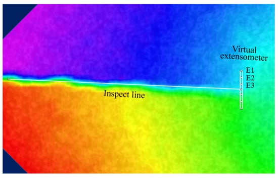 To obtain the low-cycle fatigue crack length of the CT specimen subjected to cyclic loading, along with the corresponding number of loading cycles and CTOD, the experimental observation setup comprises strain gauges, extensometers, and a Digital Image Correlation (DIC) system. The strain gauges are employed to monitor the strain variation at the crack tip and the propagation of crack growth, while the extensometer is utilized for measuring the raw data of CTOD. The DIC system is responsible for recording the crack growth length corresponding to each loading cycle. The experimental setup, involving the extensometer, strain gauges, and DIC observation system, utilizing the HT-SUA502M-T industrial camera, is depicted in Figure 5 and Figure 6. In order to establish a correlation between data points and surface strain deformation dimensions during subsequent data processing, speckle patterns are sprayed onto the specimen surface during the experimental pre-processing stage. The high-speed camera is set to capture 60 frames per second, meaning that 60 images are captured within one second of each trigger, allowing for the observation of crack growth and plastic zone variations during the cyclic loading process. Subsequently, the images of the crack tip captured by the high-speed camera are imported into the VIC-2D image processing software, and crack length is measured based on the initial calibration values, as illustrated in Figure 7.