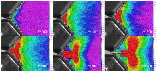 During the experimental process, the crack propagation behavior at the crack tip was captured using an industrial camera, and through software processing, the variation in the plastic deformation zone at the crack tip with the number of loading cycles, N, was obtained, as shown in Figure 8. Under the loading condition with a maximum load of 44 kN and a load ratio of 0.1, when the number of loading cycles was 200, 1200, 1800, 3000, 5000, and 5400, the plastic deformation zone at the crack tip (highlighted in red in Figure 9) gradually increased with the increasing number of cycles until the specimen failed. At the beginning of loading, the plastic deformation zone at the crack tip was negligible, but as the cycles progressed, this area became increasingly significant and expanded gradually. This indicates that cyclic loading induces plastic deformation at the crack tip, which accumulates progressively. The accumulative plastic deformation at the crack tip has a cumulative effect on crack propagation under large-scale yielding conditions, as well as on the values of CTOD, leading to accelerated crack propagation with additional damage. Therefore, considering the impact of accumulative plasticity is crucial in the study of low-cycle fatigue crack propagation behavior.