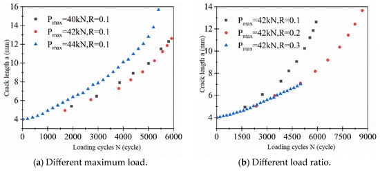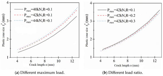 As observed from Figure 9, the size of the plastic zone at the crack tip gradually increases with the propagation of the crack length. Figure 10a illustrates the variation in the plastic zone size at the crack tip for different maximum loads, where, under a constant load ratio, the plastic zone size increases with the augmentation of the maximum load. Figure 10b depicts the variation in the plastic zone size at the crack tip for different load ratios, and with the applied maximum load remaining constant, the change in plastic zone size is not prominently affected by different load ratios. The curves depicting the variation in crack length with loading cycles under different loading conditions are illustrated in Figure 10.