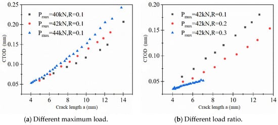 From Figure 11, it can be observed that, under a constant load ratio, the crack growth length corresponding to the same number of cycles increases with the increment of the maximum load, and CTOD also increases accordingly. When the maximum load is the same, with an increase in the load ratio, the fatigue crack growth length corresponding to the same number of cycles decreases, and CTOD also decreases. This phenomenon indicates that the magnitude of crack propagation rate is primarily determined by the range of the applied load. Changes in the load range result in variations in the driving force for crack propagation, represented by the change in CTOD, thereby influencing the crack propagation rate.