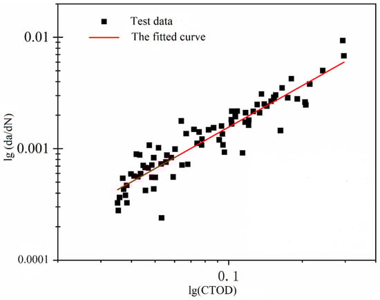 The observations from the low-cycle fatigue crack propagation experiments indicate that applied loading influences the crack propagation rate through its impact on CTOD. Therefore, CTOD is employed as a fracture parameter to characterize the crack tip propagation behavior. Based on the CTOD data obtained from the low-cycle fatigue crack propagation experiments, a model for crack propagation rate, represented by the fracture parameter CTOD, is fitted as illustrated in Figure 12.